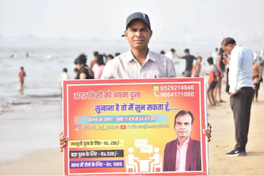 కష్టాలు వింటా.. ఫీజు తీసుకుంటా! ముంబై బీచ్‌లో ఓ వ్యక్తి వింత వ్యాపారం.. వీడియో ఇదిగో!